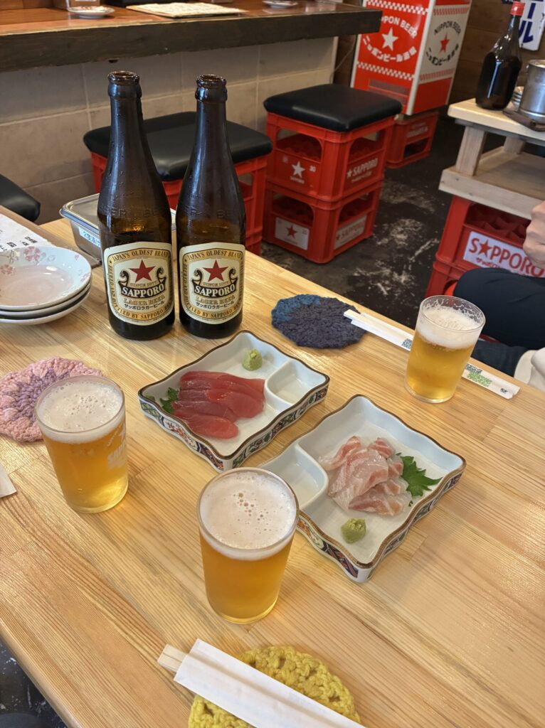 まぐろとタイのお刺身をチョイスして、「赤星」でかんぱーい!