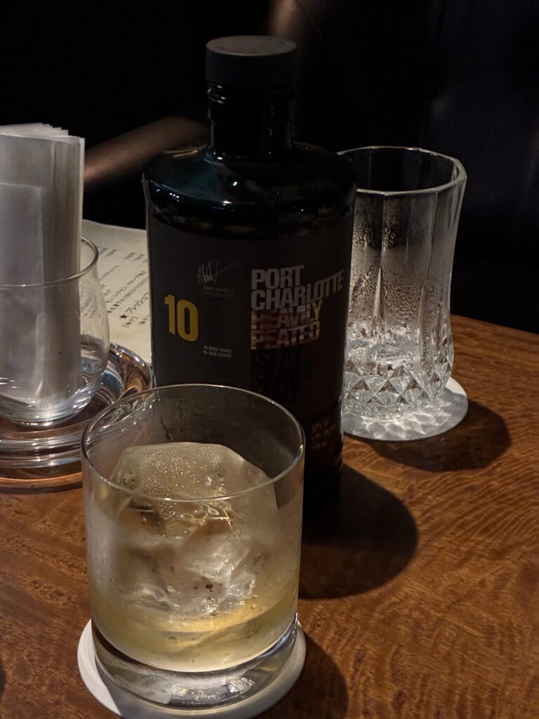 マティーニのあとは、大好きなアイラ・モルト。まだ試したことのない銘柄で迷っていると、「ポートシャーロット10年」が目に入り、思わず注文。